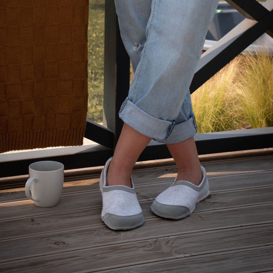Bosonogi copati iz naravnega filca in z gumijastim podplatom.