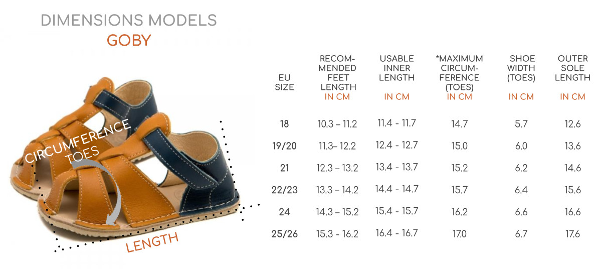 Zaprti ročno izdelani sandali iz kvalitetnega, mehkega usnja. Goby bosonogi sandali so izjemno lahki ter udobni in omogočajo otroškim stopalom naravno gibanje brez kakršnihkoli omejitev. Primerni so za vsakodnevne dejavnosti na prostem, za v vrtec, na igrišču, v peskovniku ali izlet v park.