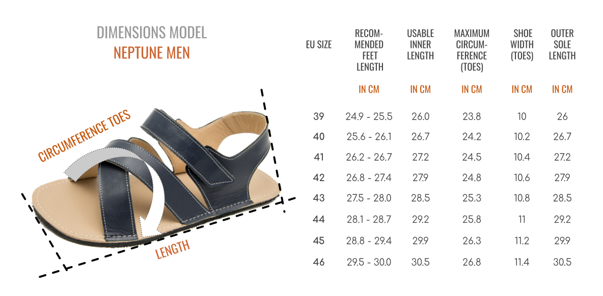 Bosonogi elegantni moški sandali Neptune so ročno izdelani iz kvalitetnega, mehkega usnja. So izjemno lahki ter udobni in se odlično podajo k različnim priložnostnim oblačilom. Primerni so za vsakodnevne dejavnosti v urbanem okolju, brez težav pa jih obujete tudi za kakšno posebno priložnost. zunanji del: naravno nappa usnje podloga: naravno usnje (brez kroma) podplat: guma Vibram® Superflex raven podplat (zero-drop) prstni del ima naravno obliko stopala tanek in prožen podplat (6 mm) čevlji se okoli gležnja prilagodijo in fiksirajo s paščkom (velcro zapenjanje) primerni so za srednje široka stopala Zeazoo čevlji ustrezajo vsem smernicam bosonoge obutve. Podplat je narejen iz izjemno lahke in upogljive Vibram® Superflex gume, ki omogoča prosto, udobno in naravno gibanje stopal brez kakršnihkoli omejitev.