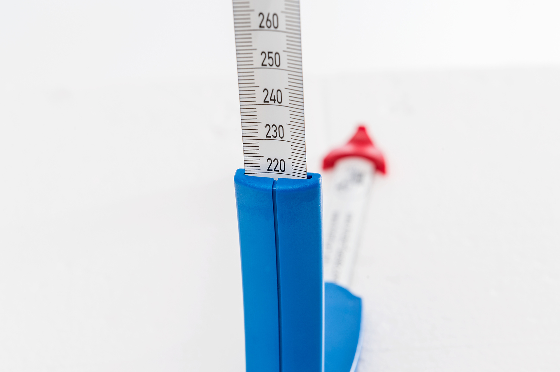 - Dolžino stopala določite tako, da peto položite na modri lok in merilni trak z rdečo puščico nastavite na najdaljši prst. Peta naj se le nežno dotika merilca.